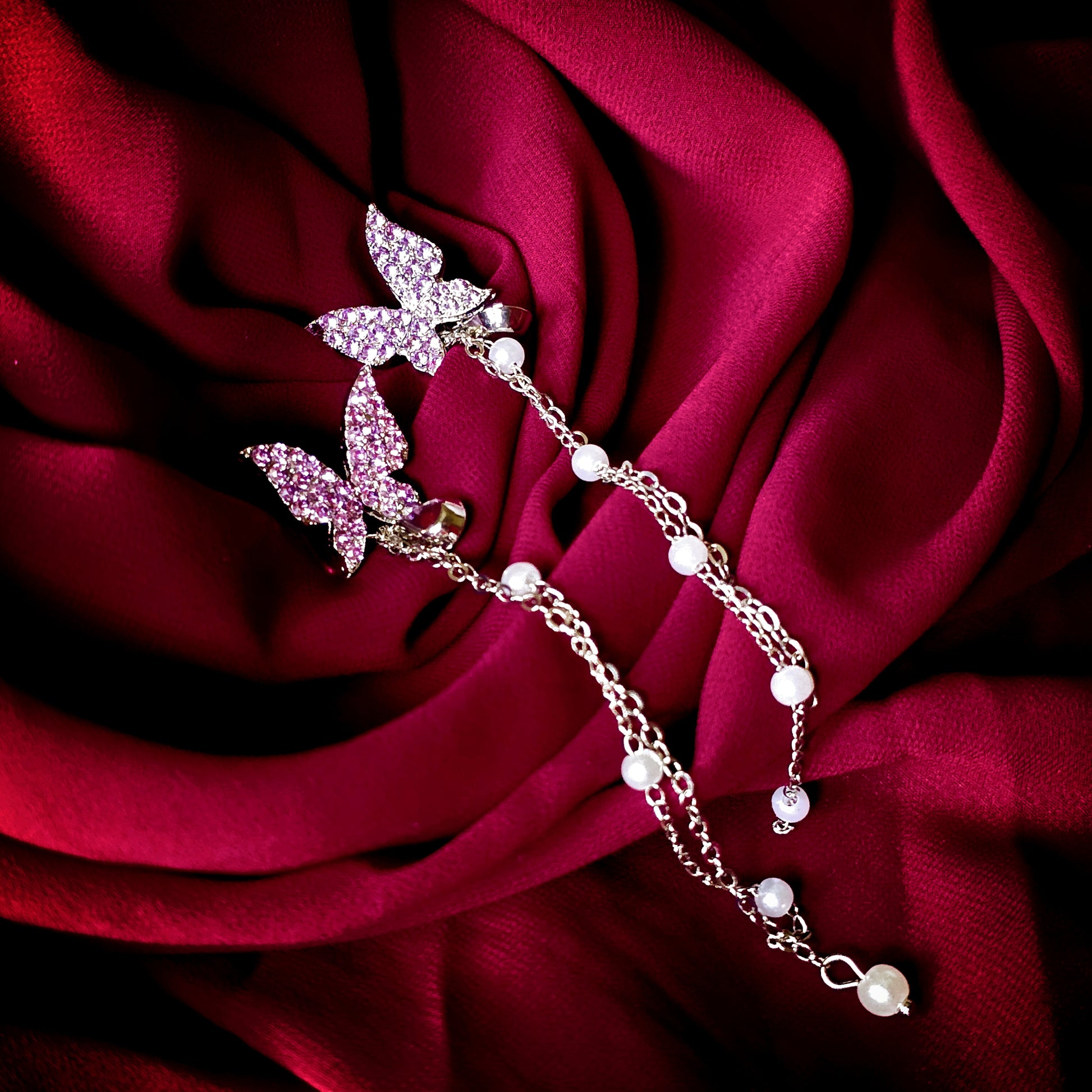 Purple butterfly tops with dangling pearl chains — a mix of fantasy and elegance in one.