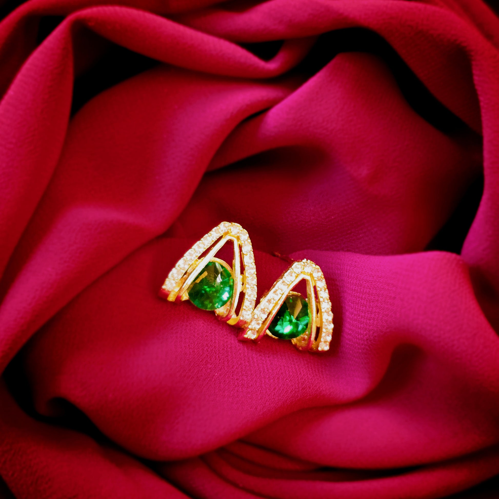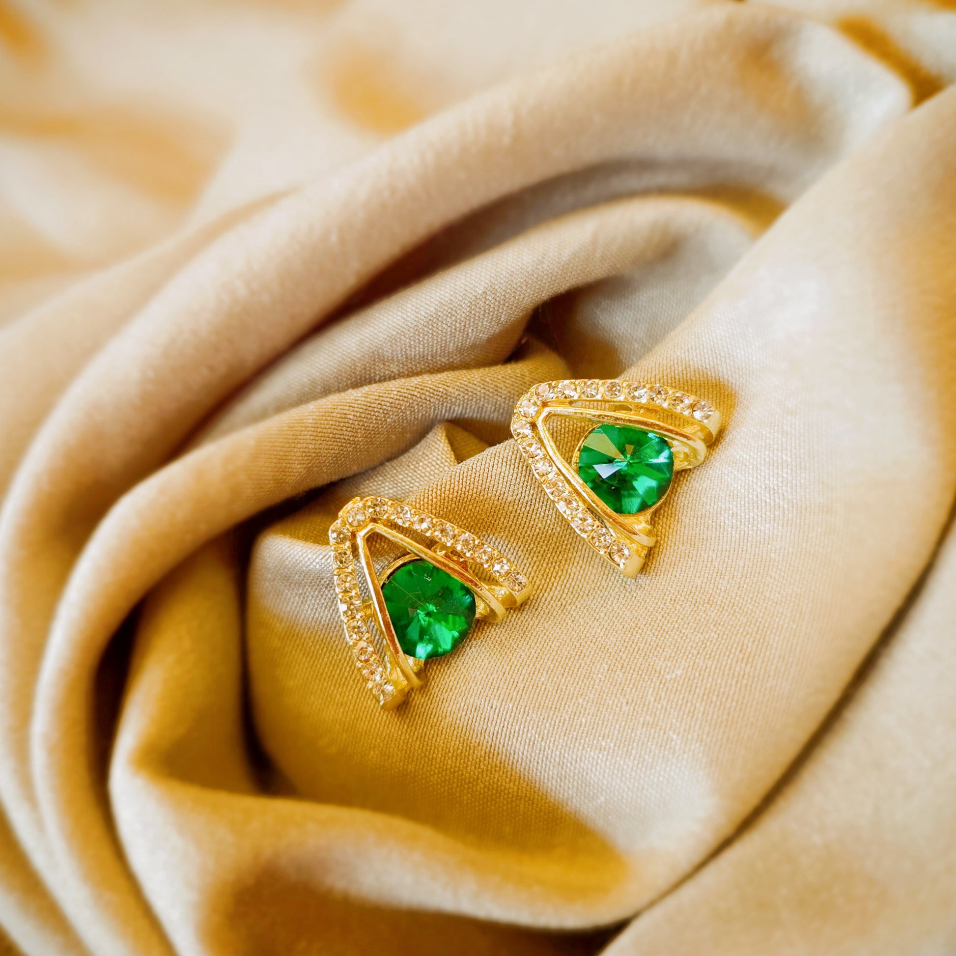 Glittering emerald-green stones framed in gold — bold yet refined.