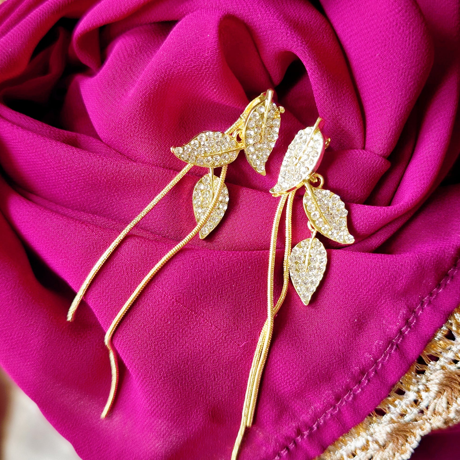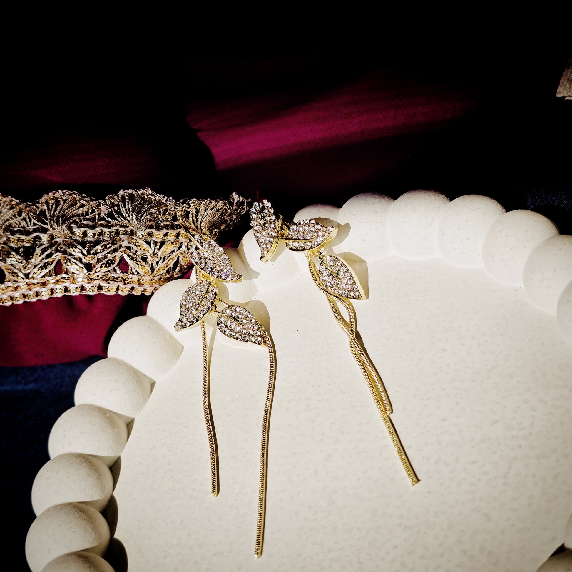 Crystal-studded leaves with golden chain drapes bring movement and elegance to your style.